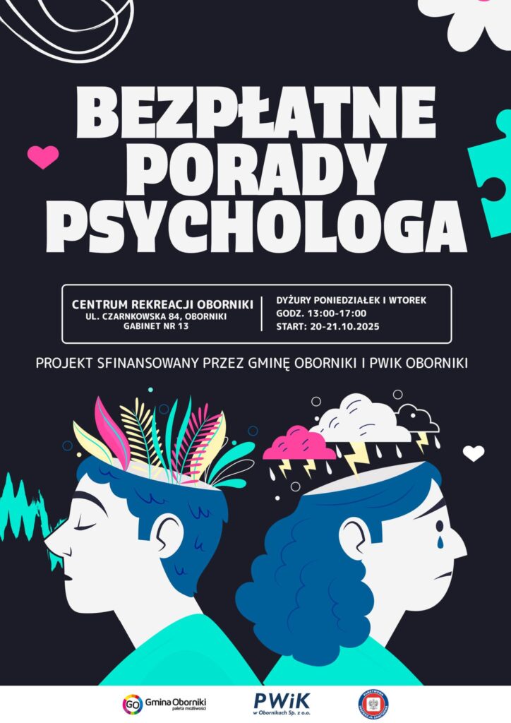 Od 20 października mieszkańcy gminy Oborniki mogą korzystać z bezpłatnych porad psychologicznych w Centrum Rekreacji Oborniki. Spotkania odbywają się w poniedziałki i wtorki w godzinach 13:00–17:00, w gabinecie nr 13. Razem z PWiK Oborniki oraz Powiatową Stacją Sanitarno-Epidemiologiczną w Obornikach rozpoczynamy nową inicjatywę profilaktyczną, której celem jest propagowanie zdrowego stylu życia i przeciwdziałanie problemom wynikającym z niezdrowych nawyków.