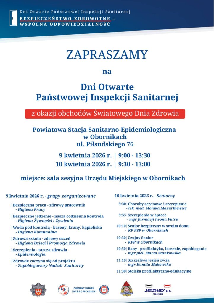 W dniach 9 i 10 kwietnia 2026 roku w Obornikach odbędą się Dni Otwarte Państwowej Inspekcji Sanitarnej, organizowane z okazji obchodów Światowego Dnia Zdrowia. Wydarzenie ma na celu promocję zdrowego stylu życia, zwiększenie świadomości zdrowotnej oraz przybliżenie mieszkańcom działań służb sanitarnych.