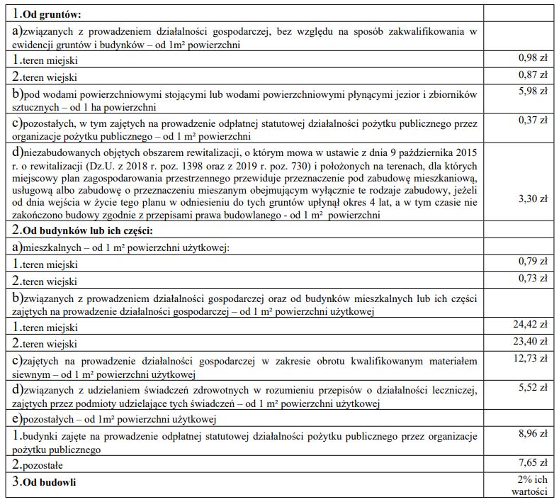 Dla budynków mieszkalnych stawki wyniosą odpowiednio 0,79 zł/m² w mieście i 0,73 zł/m² na wsi, a grunty dla tych budynków – 0,37 zł. Podatek od budowli określono na poziomie 2% ich wartości. Uchwała przewiduje również preferencje i zwolnienia między innymi dla budynków służących kulturze, sportowi, ochronie przeciwpożarowej oraz miejsc pamięci narodowej.