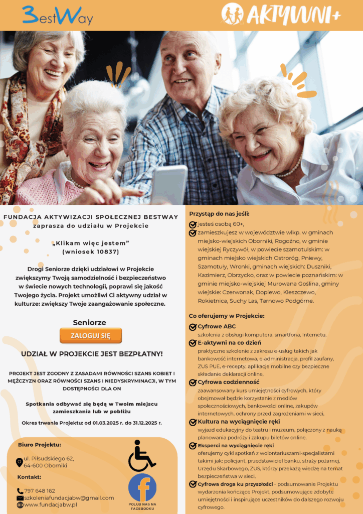 Fundacja Aktywizacji Społecznej Bestway zaprasza Seniorów do wzięcia udziału w programie „Klikam, więc jestem” dofinansowanym ze środków programu wieloletniego na rzecz Osób Starszych „Aktywni+” na lata 2021-2025. Celem projektu jest włączenie cyfrowe osób 60+, poprzez organizację bezpłatnych działań na rzecz zwiększania umiejętności posługiwania się nowoczesnymi technologiami i korzystania z nowych mediów przez osoby starsze, oraz upowszechnianie i wdrażanie rozwiązań technologicznych sprzyjających włączaniu społecznemu, oraz bezpiecznemu funkcjonowaniu osób starszych.