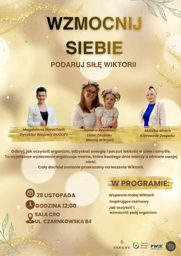 29 listopada w sali CRO przy ul. Czarnkowskiej 84 odbędzie się pokaz kosmetyków Duolife. Wydarzenie organizowane przez Mamę Wiktorii Rembacz, Stowarzyszenie Oborniki Pomagają Pomagamy Bo Wielkie Serca Mamy oraz zespół Duolife, który podzieli się wiedzą o tym, jak wzmocnić organizm, odzyskać energię i zadbać o dobre samopoczucie.