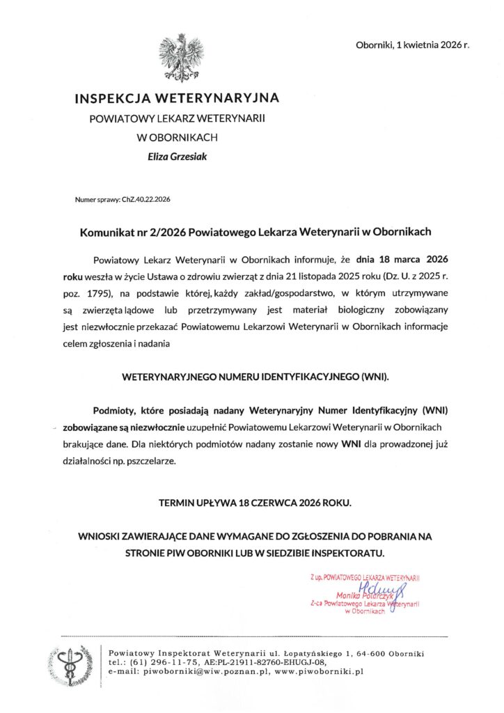 02.04.2026 Komunikat Powiatowego Lekarza Weterynarii Powiatowy Lekarz Weterynarii w Obornikach informuje: