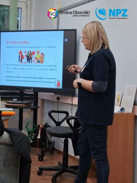 Pierwszą część spotkania poprowadziła Monika Osak z Powiatowej Stacji Sanitarno-Epidemiologicznej w Obornikach, omawiając zagadnienia dotyczące HIV i AIDS oraz obalając najczęściej powtarzane mity.