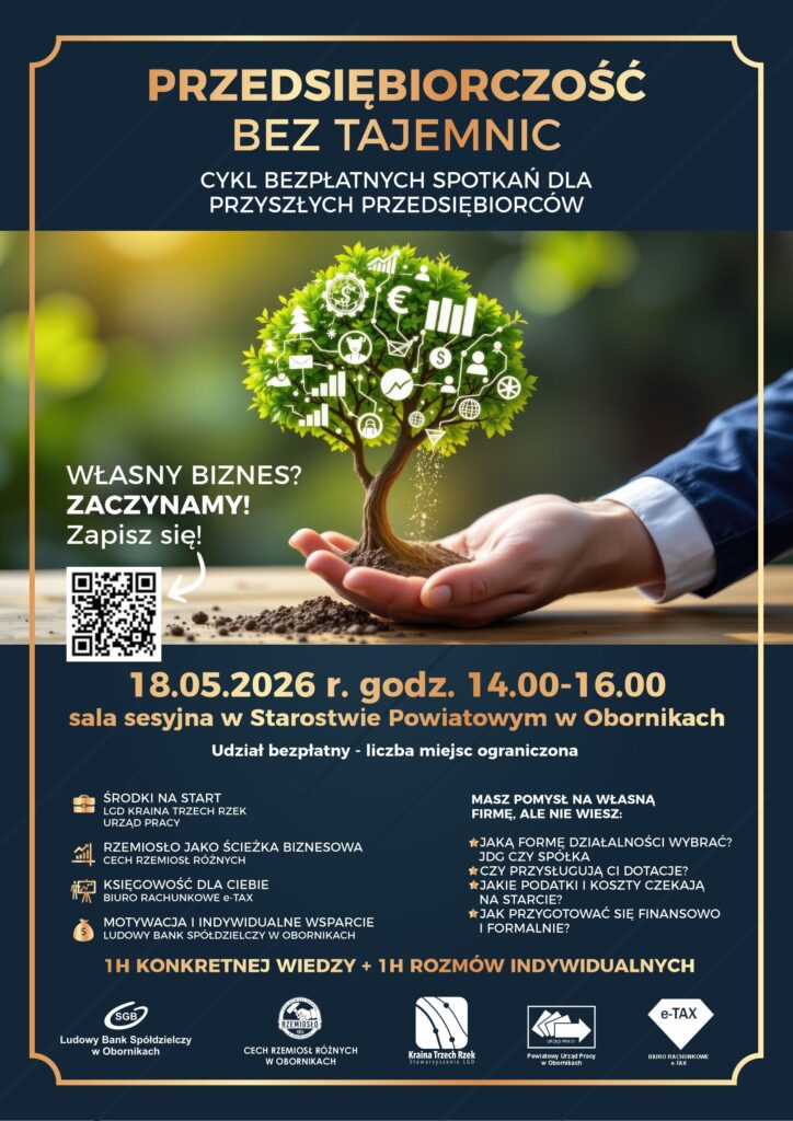 18 maja, w godzinach 14:00–16:00 w sali sesyjnej Starostwa Powiatowego w Obornikach odbędzie się wyjątkowe wydarzenie skierowane do osób planujących założenie własnej działalności gospodarczej. Spotkanie organizowane w ramach cyklu „Przedsiębiorczość bez tajemnic” to doskonała okazja, aby zdobyć praktyczną wiedzę oraz skonsultować swoje pomysły biznesowe z ekspertami.