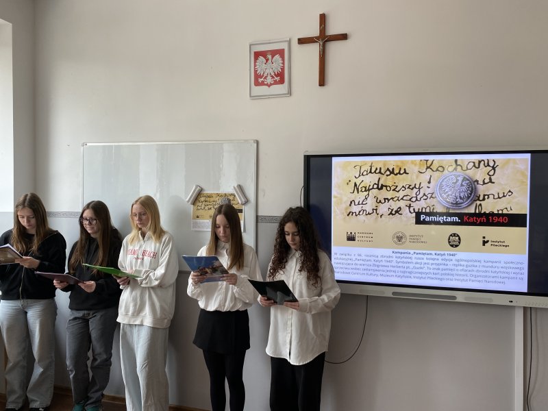 Uczniowie klas ósmych przygotowali okolicznościową gazetkę tematyczną, a także przeprowadzili krótkie prezentacje w poszczególnych klasach, przybliżając swoim koleżankom i kolegom trudne i bolesne karty historii Polski. Ważnym elementem działań było symboliczne przekazywanie guzików – znaków pamięci o ofiarach Katynia.