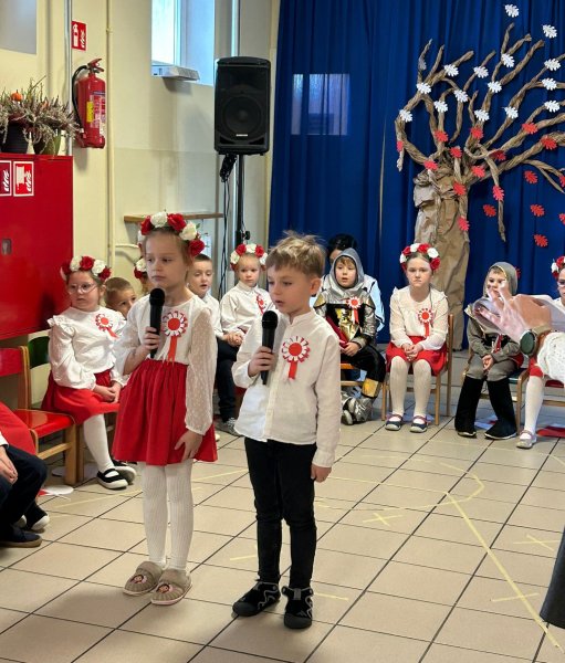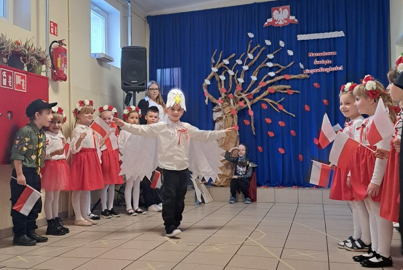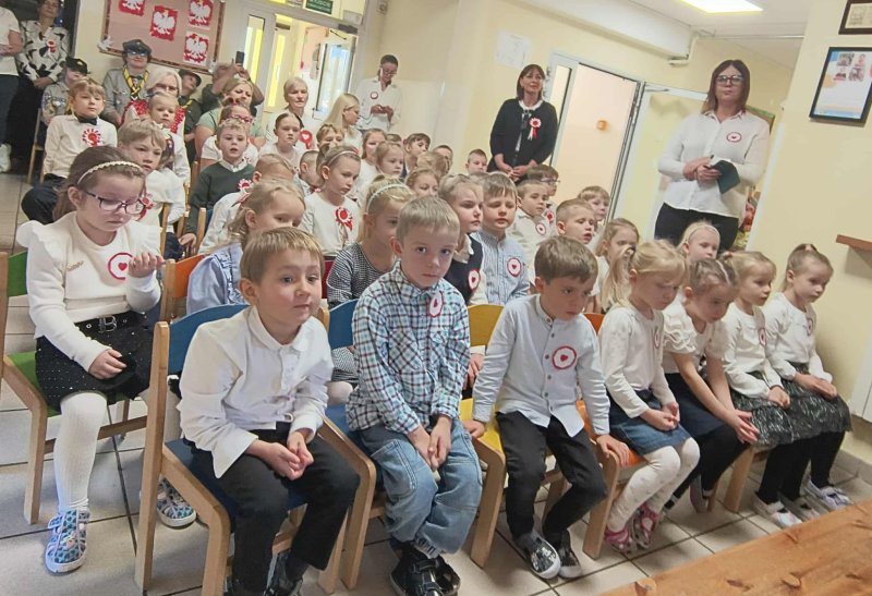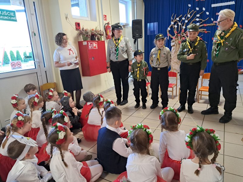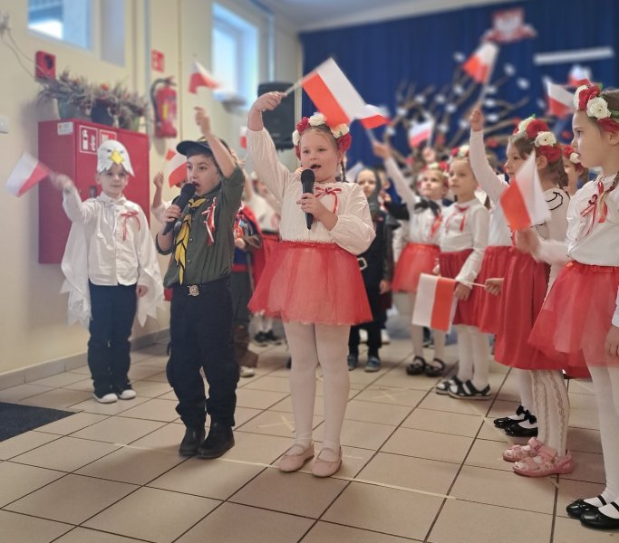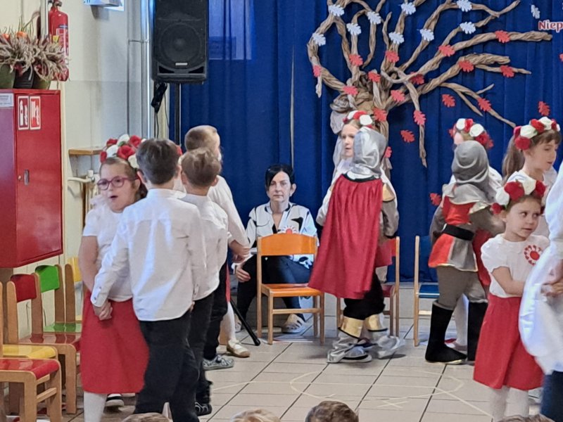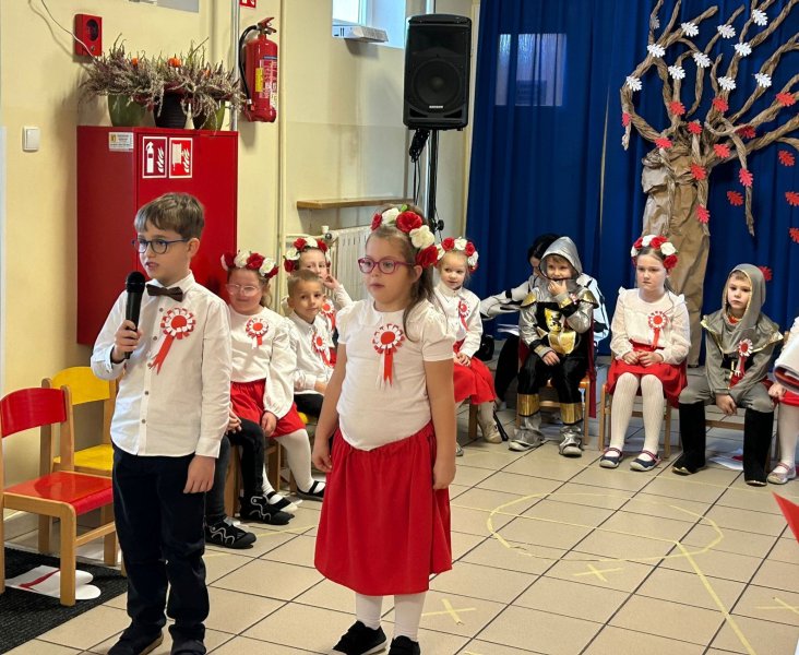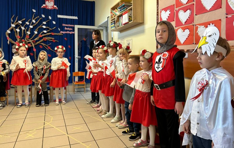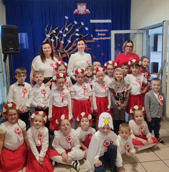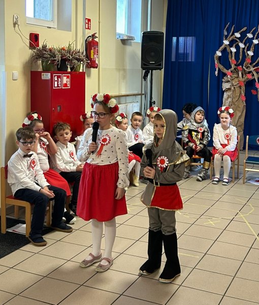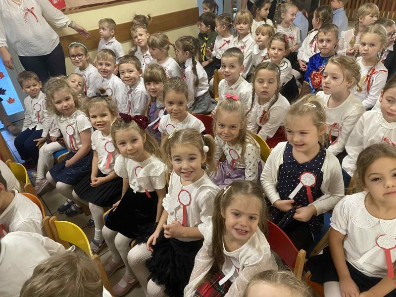 Dla utrwalenia wiadomości o naszej ojczyźnie dzieci oglądały zdjęcia i fotografie najważniejszych miejsc w Polsce, wykonały prace plastyczne, kotyliony i uczestniczyły w pięknej uroczystości, którą przygotowały najstarsze grupy: „Kubusie” i „Biedronki” wraz z wychowawczyniami. Wszyscy z zainteresowaniem i w dużym skupieniu oglądali przedstawienie o symbolach narodowych Polski. Krótka inscenizacja „Legendy o powstaniu państwa polskiego”, montaż słowno-muzyczny, odśpiewanie hymnu państwowego oraz rozmowa z zaproszonymi Gośćmi Harcerzami i Zuchami –  którymi była pięcioosobowa Rodzina naszego przedszkolaka Grzesia Muszyńskiego, to pielęgnowanie polskiej kultury i tradycji oraz rozwijanie poczucia przynależności narodowej, a także lekcja historii i patriotyzmu. Uczestnicząc corocznie w obchodach Święta Niepodległości dajemy wyraz pamięci o tych wszystkich, dzięki którym żyjemy w wolnej Polsce.