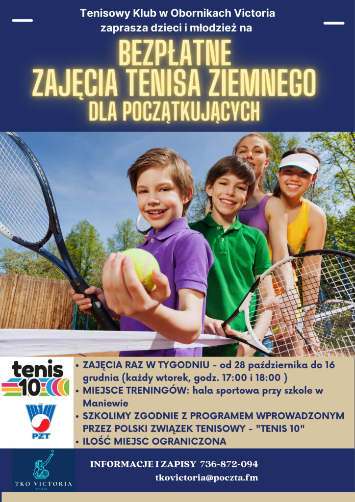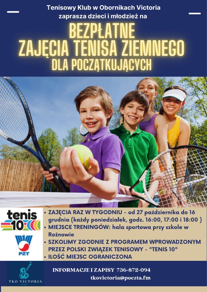 Tenisowy Klub Oborniki Victoria zaprasza dzieci i młodzież z gminy Oborniki na bezpłatne zajęcia tenisa ziemnego dla początkujących! To doskonała okazja, by rozpocząć przygodę z jedną z najbardziej wszechstronnych dyscyplin sportowych, rozwijającą koordynację, refleks i kondycję — a przede wszystkim dającą mnóstwo radości.