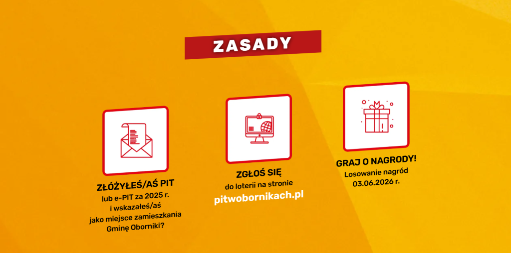 Zwycięzcy zostaną powiadomieni mailowo (oraz ewentualnie SMS-em) i będą zobowiązani w ciągu 3 dni przesłać dokumenty potwierdzające złożenie deklaracji PIT w Obornikach. Brak weryfikacji skutkuje przyznaniem nagrody osobie rezerwowej.