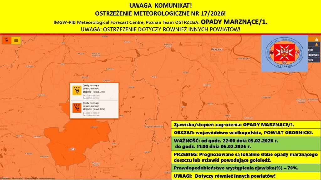 Na podstawie komunikatu IMGW-PIB informujemy, że na terenie powiatu obornickiego obowiązuje ostrzeżenie przed marznącymi opadami deszczu powodującymi gołoledź.