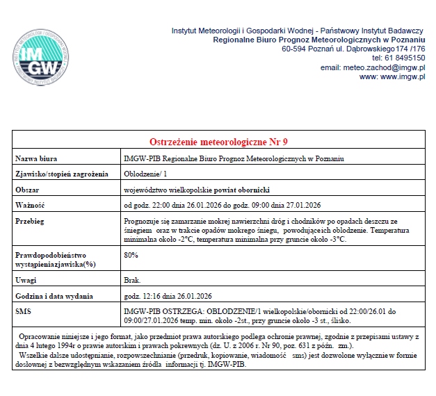 W związku z alertami IMGW o spodziewanych opadach deszczu i śniegu najbliższej nocy i jutrzejszego rana oraz zamarzaniu mokrej nawierzchni, we wtorek 27 stycznia odwołane zostają wszystkie zajęcia lekcyjne w szkołach podstawowych i średnich na terenie Gminy Oborniki.