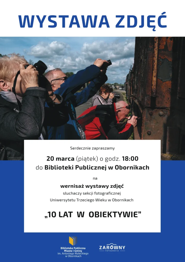 Już 20 marca o godz. 18:00 w Bibliotece Publicznej Miasta i Gminy w Obornikach odbędzie się wernisaż wystawy fotograficznej zatytułowanej 10 lat w obiektywie”. Ekspozycja prezentuje dorobek słuchaczy sekcji fotograficznej działającej przy Uniwersytecie Trzeciego Wieku w Obornikach.