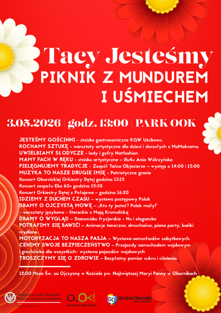 Z okazji Narodowego Święta Konstytucji 3 Maja zapraszamy do wspólnego świętowania podczas wydarzenia „Tacy Jesteśmy – Piknik z mundurem i uśmiechem”. Spotykamy się w Parku Obornickiego Ośrodka Kultury o godz. 13:00!