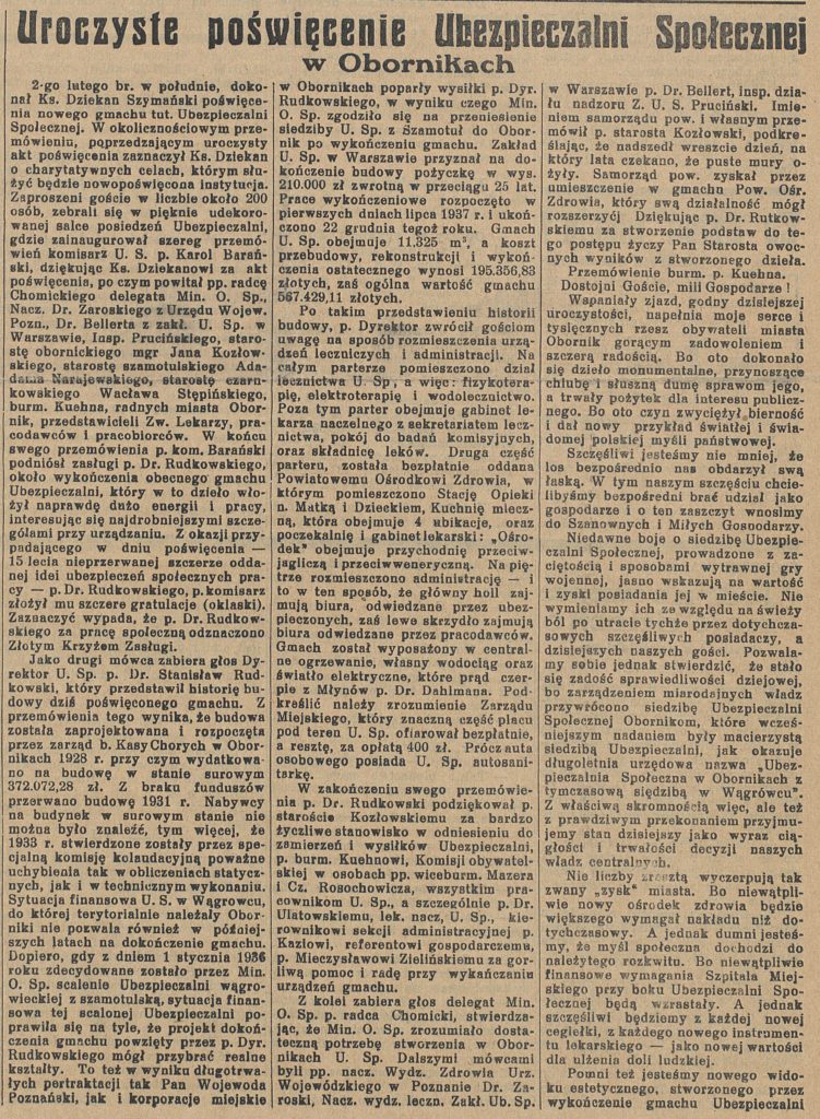 - 2 lutego 1938 r. dokonano otwarcia Ubezpieczalni Społecznej w Obornikach. W uroczystości udział wzięło ponad 200 zaproszonych gości. (aktualnie budynek Urzędu Miejskiego w Obornikach )