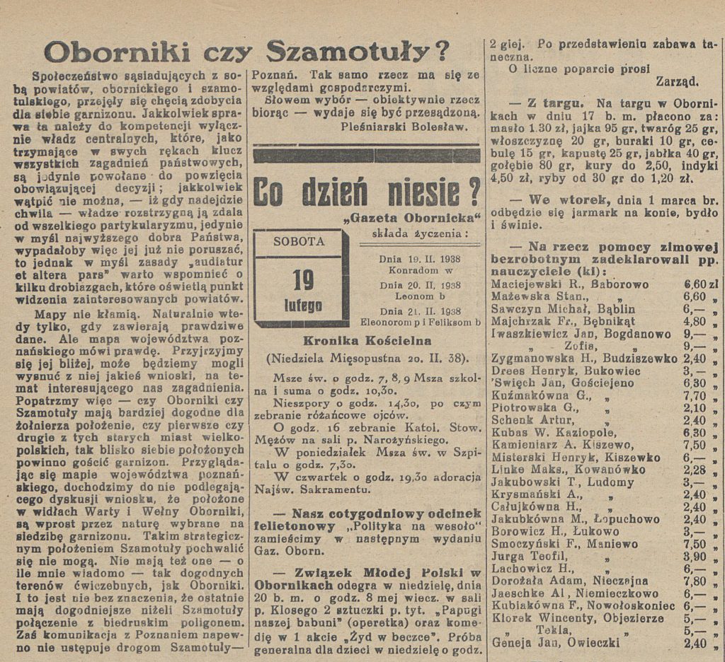 - 19 lutego 1904 r. w lecznicy w pod Obornikami leczono 79 chorych na gruźlicę. Jako wyleczonych wpisano 31 osób, 21 z poprawą stanu zdrowia, 19 jako niedoleczonych, 2 zmarło.