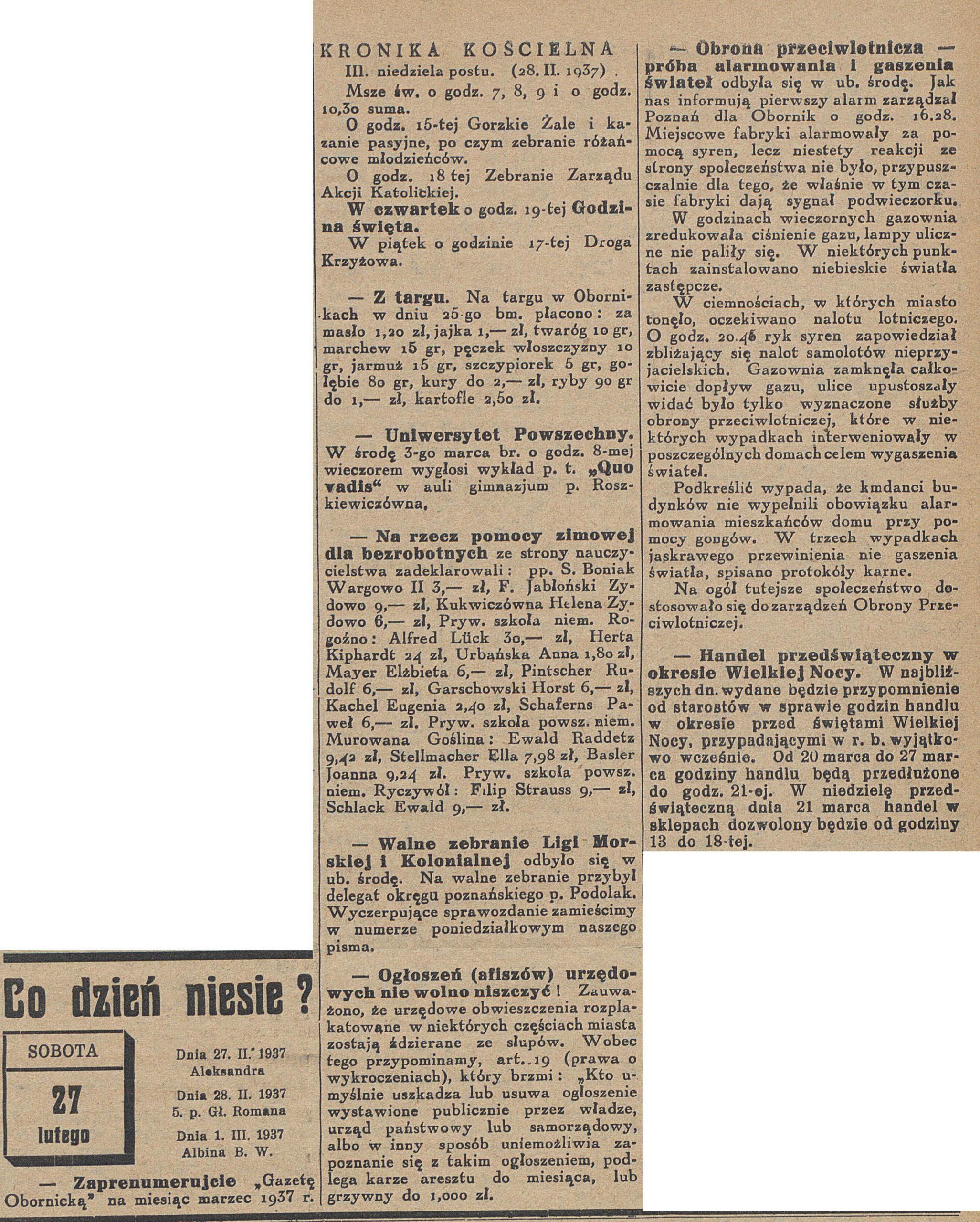 - 27 lutego 1926 r. wydany zostało rozporządzenie policyjne o zakazie urządzania w czasie Wielkiego Postu tańców w lokalach publicznych i zabaw tanecznych w lokalach publicznych, oraz na wsiach. Rozporządzenie obowiązywało od środy popielcowej do Wielkiej soboty włącznie.