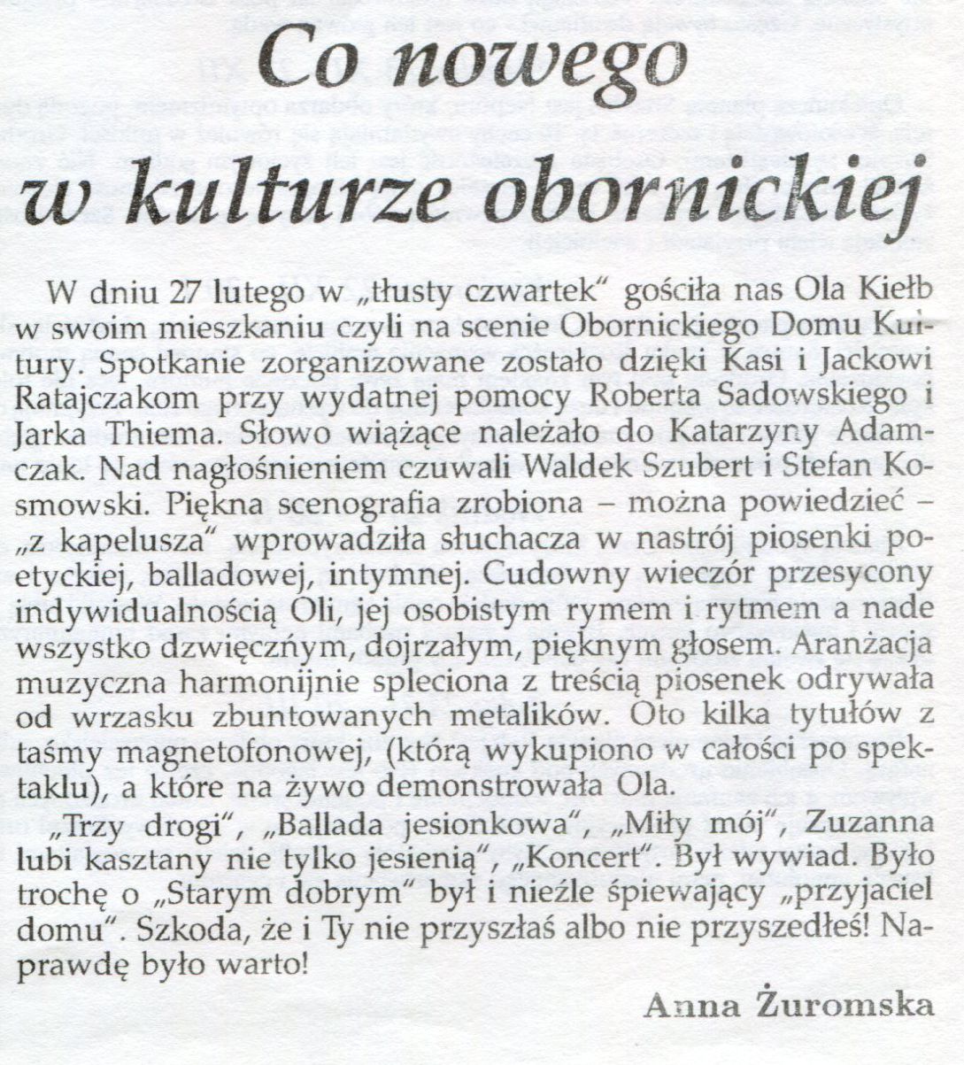 - 27 lutego 1992 r. w Obornickim Ośrodku Kultury gościła Ola Kiełb