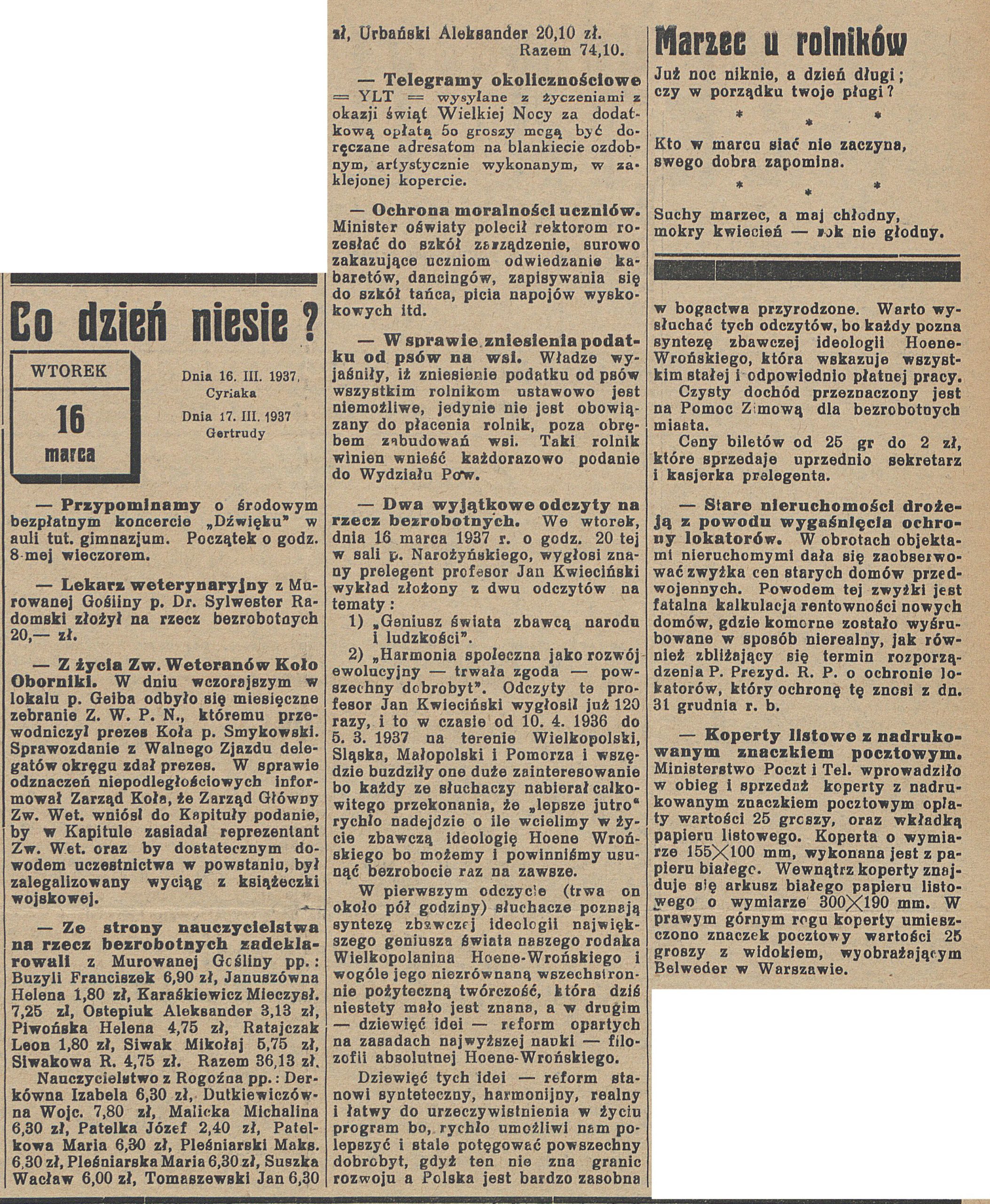 - 16 marca 1937 r. w Sali Narożyńskiego punktualnie o godz. 20.00 rozpoczął się odczyt profesora Jana Kwiecińskiego na temat „Geniusz świata, zbawcą narodu i ludzkości”, oraz „Harmonia społeczna jako rozwój ewolucyjny – trwała zgoda – powszechny dobrobyt” od kwietnia 1936 do maja 1937, profesor wygłosił już 120 takich odczytów na terenie całego kraju i budziły one duże poruszenie wśród słuchaczy