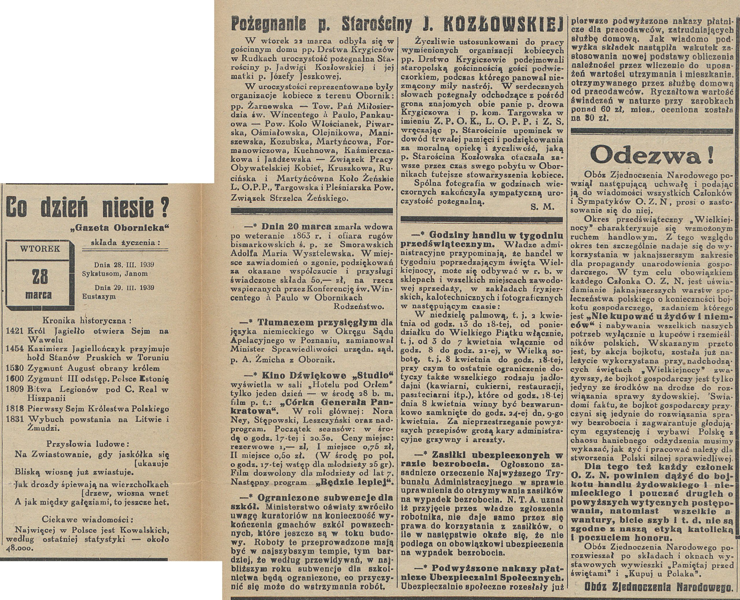 - 28 marca 1939 r. Obóz Zjednoczenia Narodowego zamieścił w Gazecie Obornickiej odezwę i prosił o stosowanie się do niej wszystkich Członków i Sympatyków OZN. Czytamy w niej: „Okres przedświąteczny Wielkiejnocy, charakteryzuje się wzmożonym ruchem handlowym, … w tym celu obowiązkiem się każdego Członka OZN jest uświadamianie jaknajszerszych warstw społeczeństwa polskiego o konieczności bojkotu gospodarczego, zadaniem którego jest nie kupować u żydów i niemców i nabywania wszelkich naszych potrzeb wyłącznie u kupców i rzemieślników polskich. Dodatkowo OZN rozwieszał po składach (sklepach) i oknach wystawowych wywieszki z napisem „Pamiętaj przed świętami i Kupuj u Polaka”