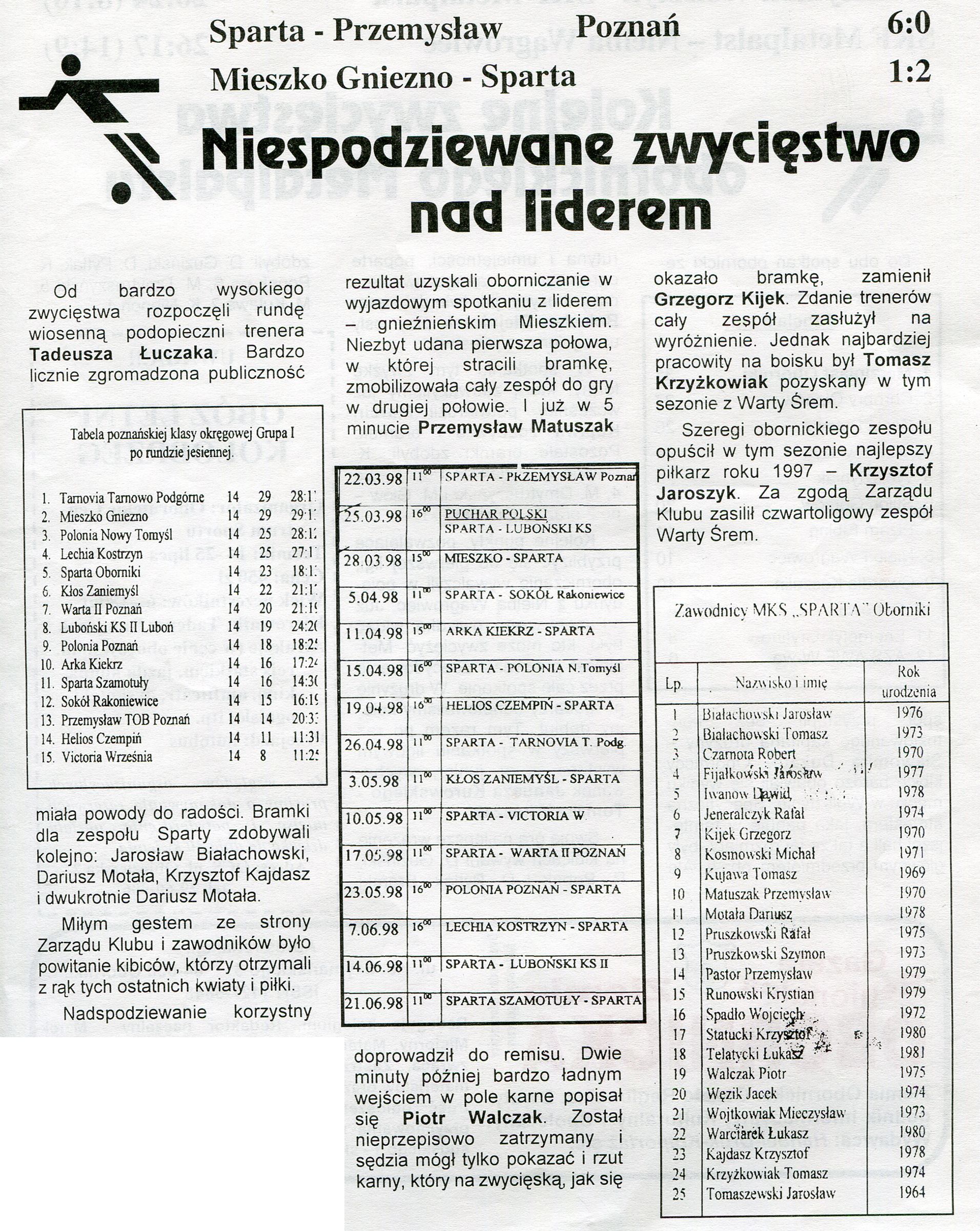 - 28 marca 1998 r. piłkarze nożni Sparty Oborniki pod wodzą Tadeusza Łuczaka pokonali na wyjeździe lidera Mieszka Gniezno 2:1. Bramki zdobyli Przeysław Matuszak i Grzegorz Kijek