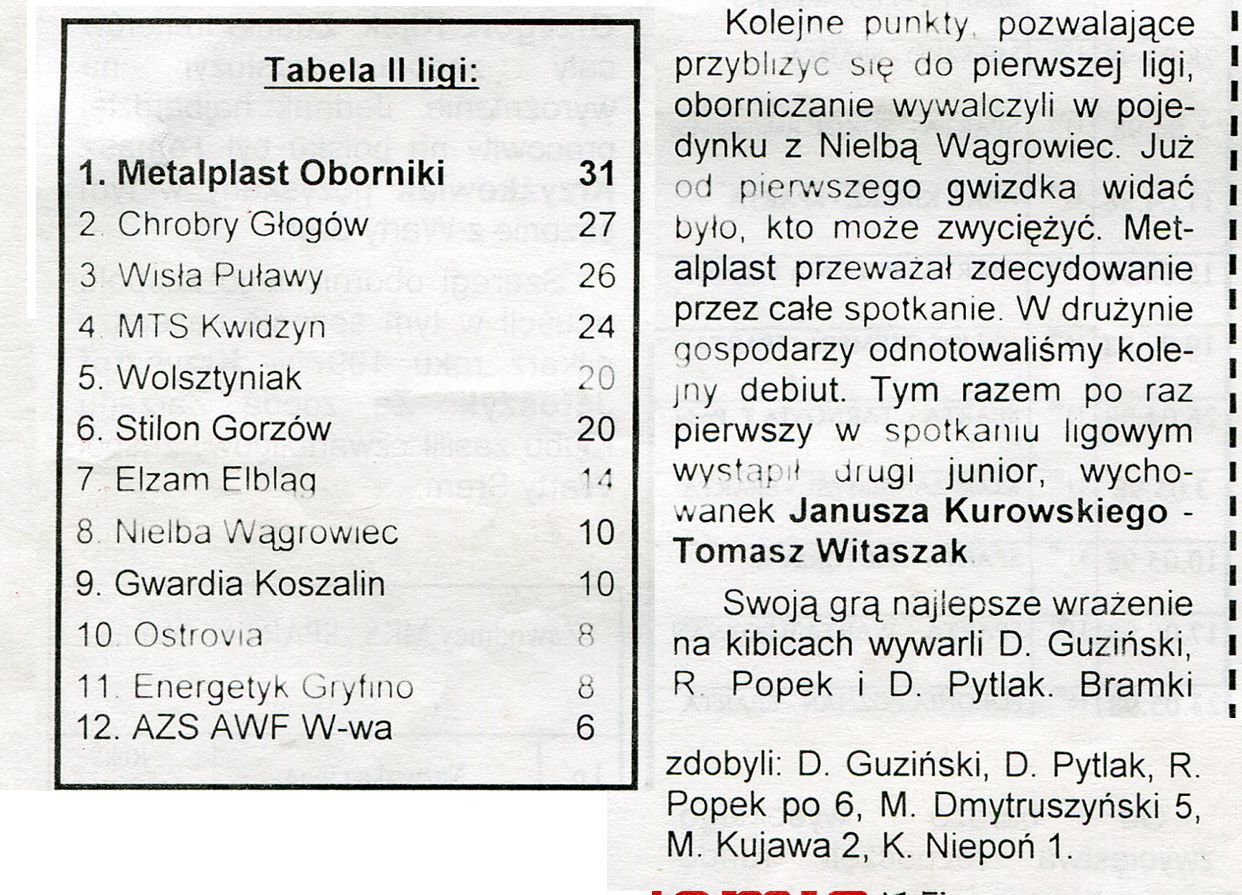 - 28 marca 1998 r. piłkarze ręczni Metalplast Oborniki pokonali we własnej hali Nielbę Wągrowiec 26:17. Mecz ten był seniorskim debiutem wychowanka Janusza Kurowskiego Tomasza Witaszaka. Bramki w tym meczu zdobywali: D. Guziński, D. Pytlak, R. Popek po 6, M. Dmytruszyński – 5, M. Kujawa – 2, K. Niepoń – 1.