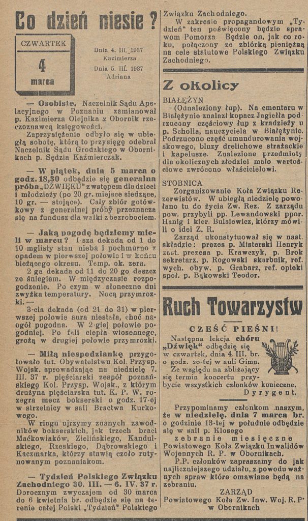 - 4 marca 1939 r. sąd grodzki w Obornikach skazał Wincentego Tecława z Rożnowa za zbywanie mąki w celu nie uiszczenia opłaty na 60 zł grzywny. Józefa Barnasia i Wojciecha Bednarza z Obornik za przyjęcie mąki od niewykrytych robotników w celu obrotu handlowego na 10 zł grzywny. Hieronima Radtke z Kiszewa za puszczanie w obieg zepsutej kiełbasy niezdatnej do użycia na 10 zł grzywny.