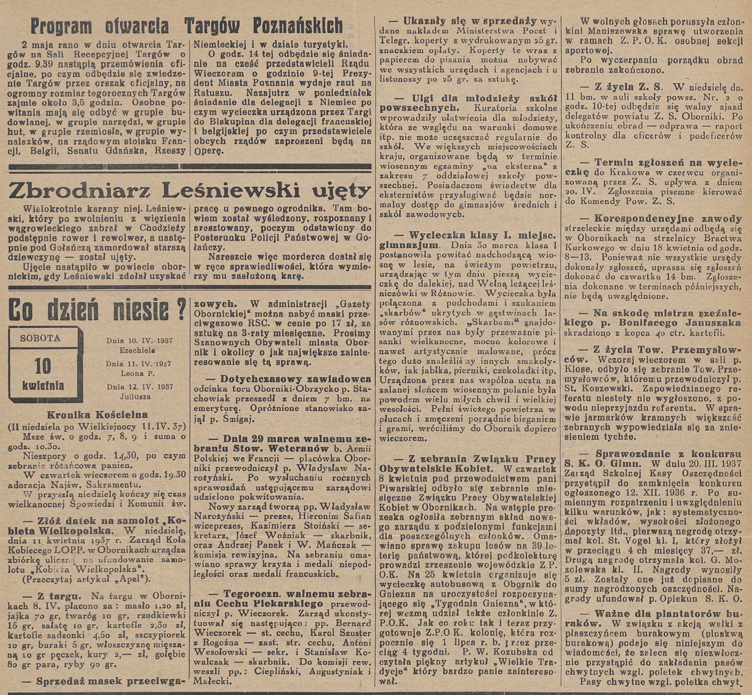 - 10 kwietnia 1937 r. Starosta Powiatowy Jan Kozłowski podał do publicznej wiadomości ceny na mięso i wyroby mięsne, które wyglądały następująco: Słonina świeża – 1,7 zł, Karbonada – 1,7 zł, Brzuchowiec – 1,5 zł, Karkówka – 1,6 zł, Rosbef – 1,6 zł, Kiełbasa zwykła – 1,6 zł, Królewiecka – 2,0 zł, Wątrobianka – 1, 8 zł, Salceson ozorowy – 2,0 zł, Kiszka z bułek – 0,8 zł, Sadło – 1,8 zł, Parówki – 2,4 zł Ceny ustalono w porozumieniu z cechem rzeźnicko – wędliniarskim w Obornikach.