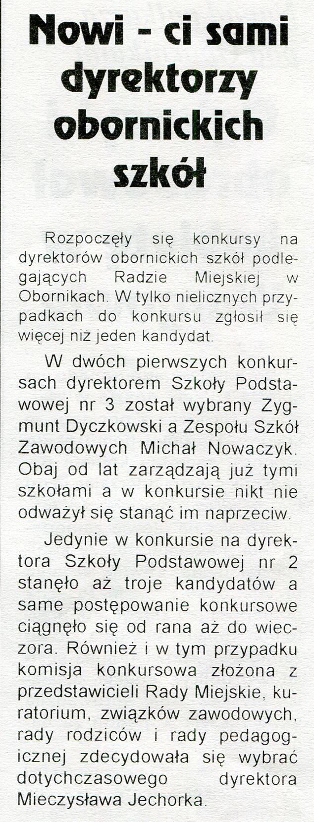 - 10 kwietnia 1997 r., Uchwałą Rady Miejskiej w Obornikach, ogłoszono konkurs na dyrektorów placówek oświatowych w mieście i gminie. Konkurs objął 15 szkół i 7 przedszkoli.