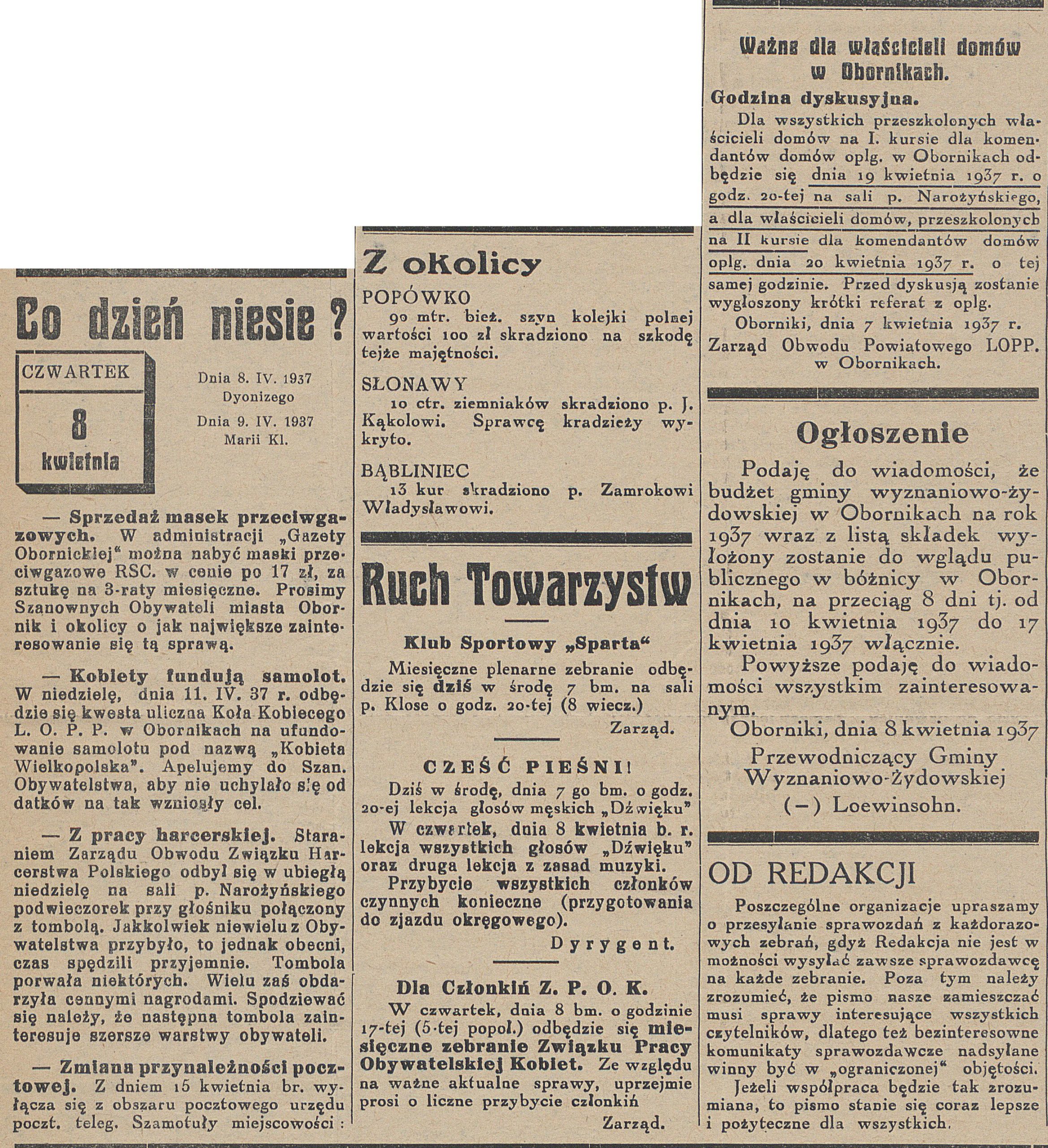 - 8 kwietnia 1937 r. w lokalu pani Klosowej odbyło się zebranie sekcji piłki nożnej KS Sparta Oborniki. Na spotkaniu ustalano kolejność treningów i meczów poszczególnych drużyn.