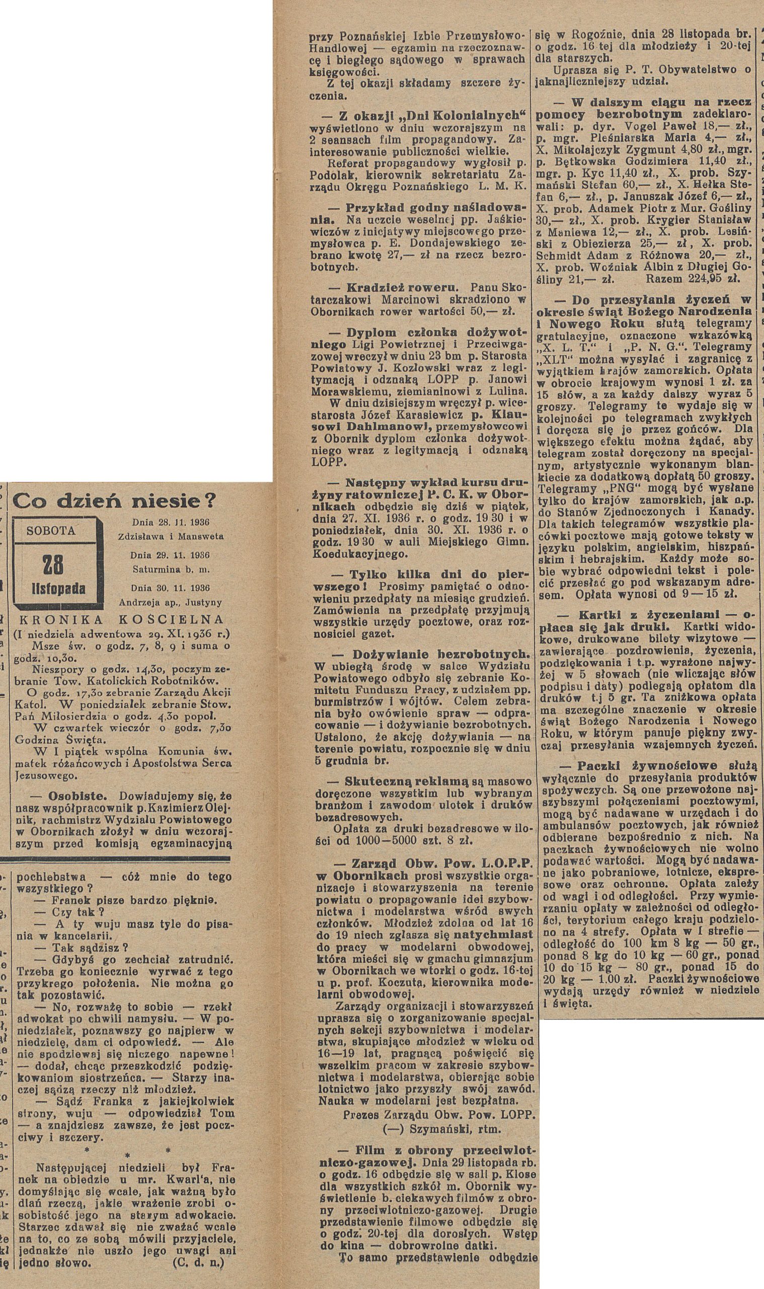 - 28 listopada 1936 r. w obecności starosty J. Kozłowskiego i przedstawicieli Komitetu Pomocy Bezrobotnym nastąpiło otwarcie Kuchni bezpłatnej. Kuchnia ta wydawała codziennie 480 dzieciom śniadania i treściwe obiady. Takie kuchnie uruchomił również komitet w Rogoźnie, Murowanej Goślinie i Ryczywole. Dodatkowo komitet wydał 1400 rodzinom porcje chleba i mięsa. Bezrobotni otrzymywali także węgiel i mydło.
