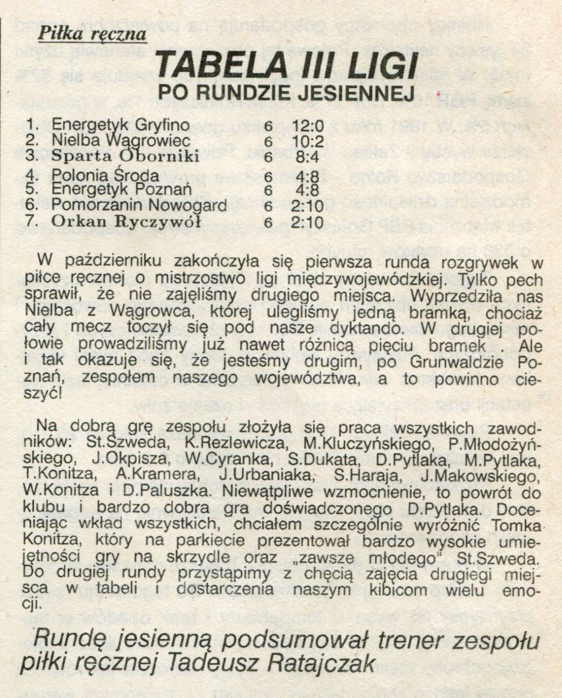 - 28 listopada 1991 r. trener piłkarzy ręcznych Sparty Oborniki podsumował rundę jesienną sezonu 1991/1992 r.