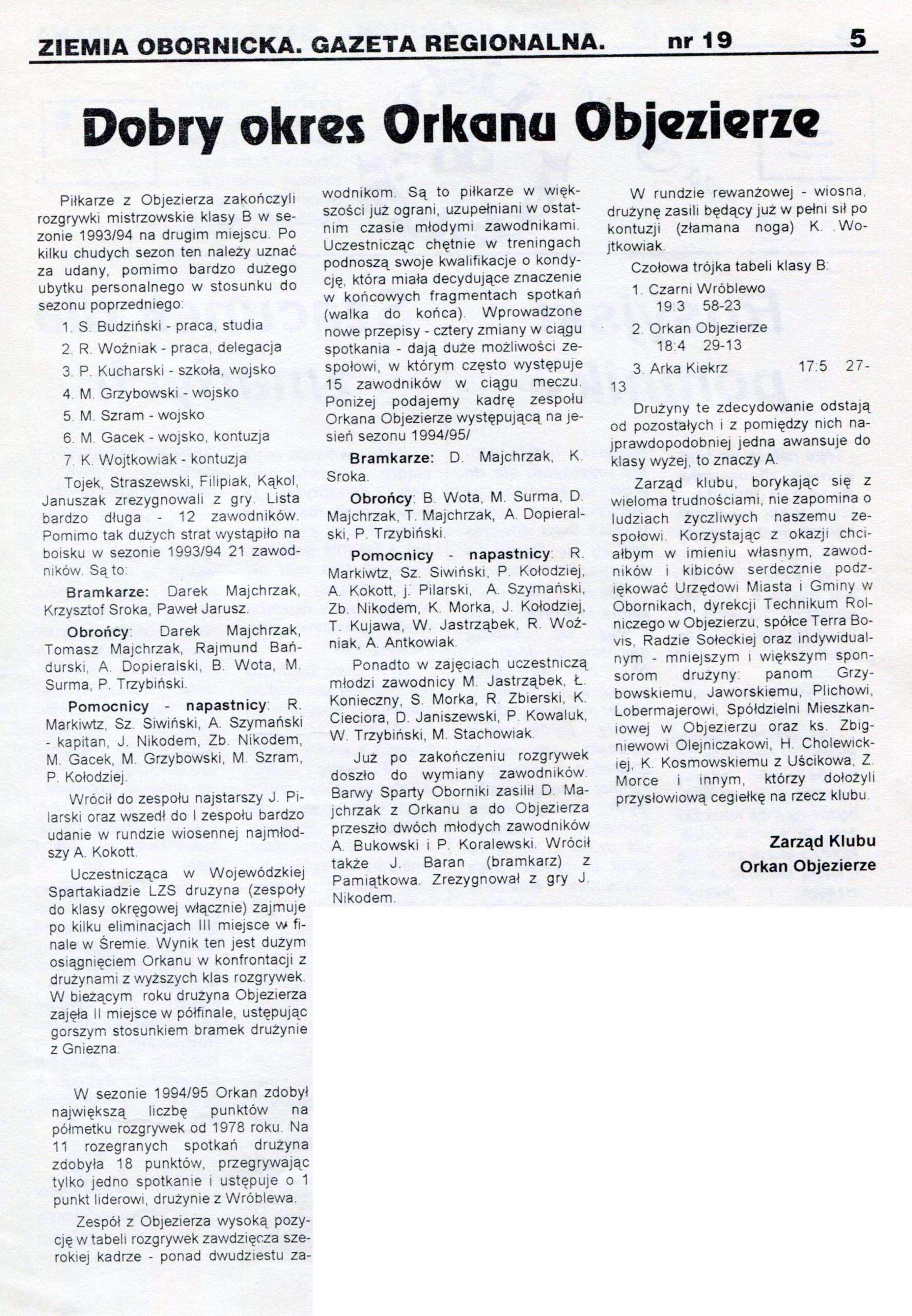 - 28 listopada 1994 r. zarząd Orkanu Objezierze podsumował rundę jesienną sezonu 1993 i przedstawił założenia klubu na wiosnę roku 1994 r.