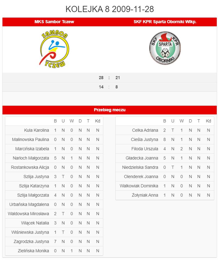 - 28 listopada 2009 r. piłkarki ręczne SKF KPR Sparta Oborniki w meczu o mistrzostwo I ligi kobiet przegrały z MKS Sambor Tczew 28:21