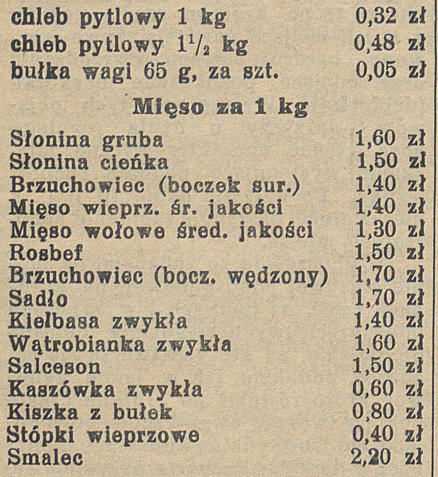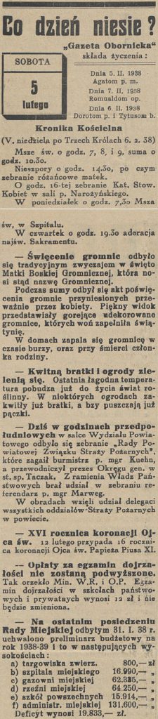 - 5 lutego 1938 r. Referendarz B. Marwig w imieniu Starosty Powiatowego wydał obwieszczenie dotyczące ustalenia ceny maksymalnej na chleb żytni, mięso i wyroby mięsne.