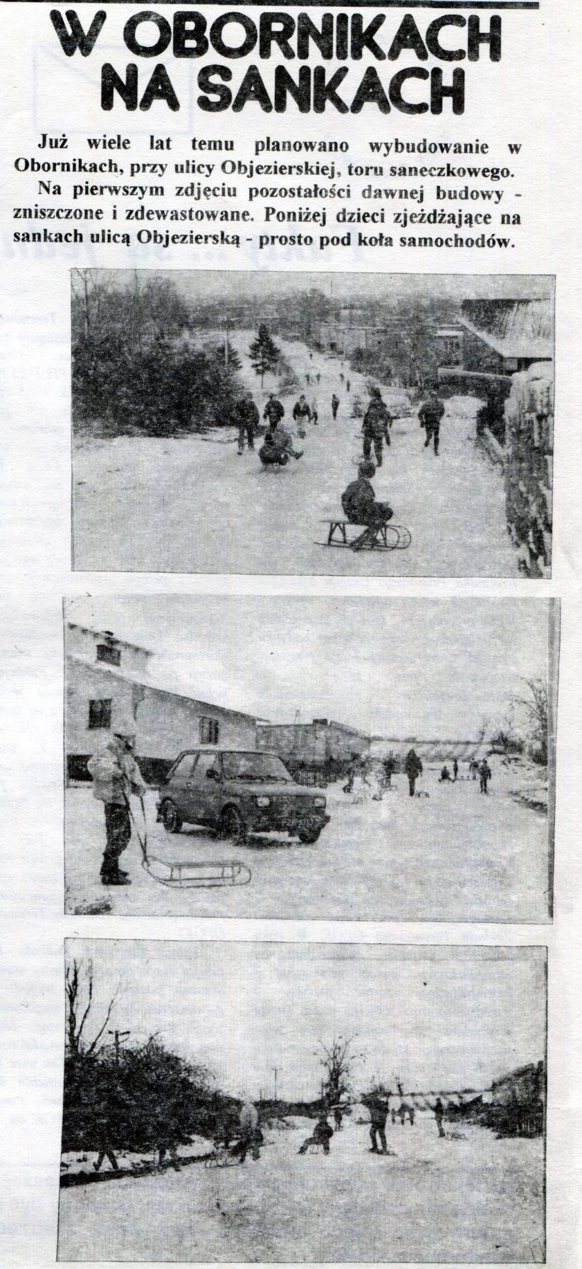 - 5 lutego 1993 r. Gazeta Obornicka tak pisała o torze saneczkowym w Obornikach. Fotografie wykonane zostały na ulicy Objezierskiej, która wyasfaltowana była tylko do stadionu, a dzieci mogły zjeżdżać od samej góry czyli od tzw. sadu księdza przy dobrych opadach śniegu sanki zatrzymywały się tuż przy skrzyżowaniu z ulicą Armii Poznań