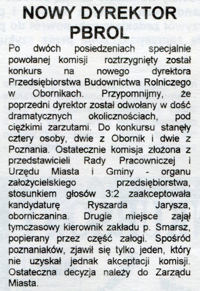- 5 lutego 1993 r. odbył się konkurs na dyrektora Przedsiębiorstwa Budownictwa Rolniczego w Obornikach. Konkurs wygrał Ryszard Jarysz z Obornik.