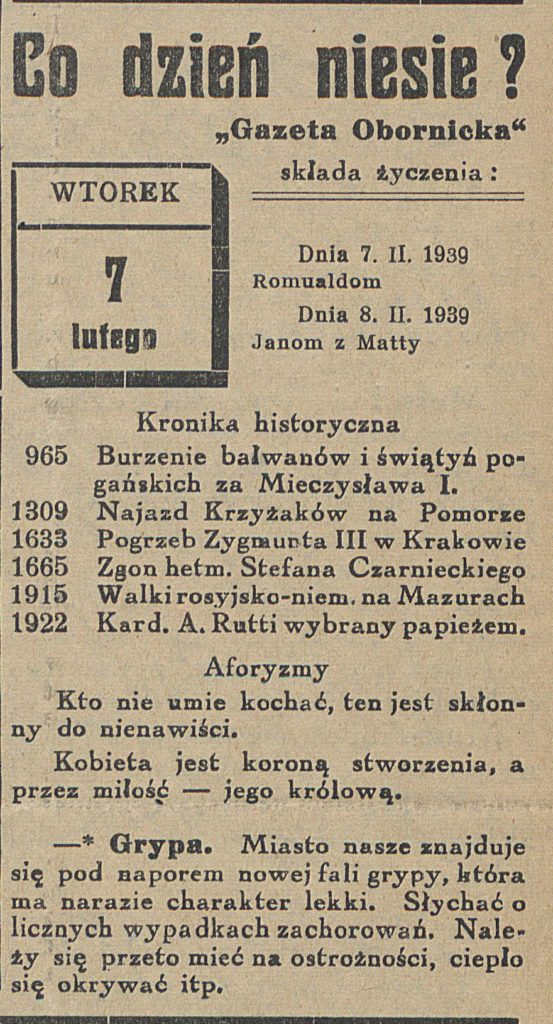 - 7 lutego 1937 r. w Sali Mańkowskiego znajdującej się w kamienicy przy ulicy Lipowej 3 odbyło się miesięczne zebranie Koła Podoficerów Rezerwy RP.