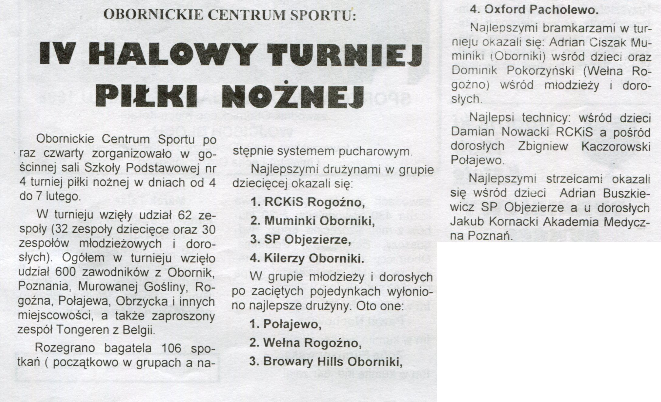 - 7 luty 1999 r. w hali przy ulicy Obrzyckiej zakończył się turniej piłki halowej przygotowany z okazji ferii zimowych.