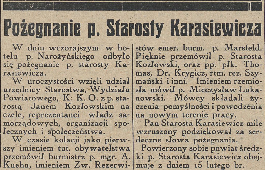 - 11 lutego 1937 r. odbyło się w Obornikach pożegnanie starosty Karasiewicza