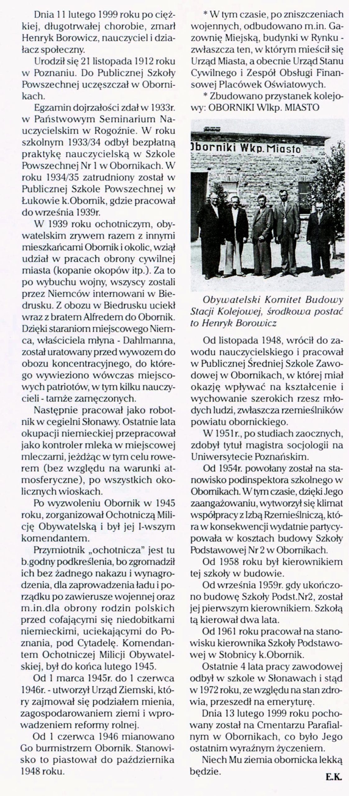 - 11 lutego 1999 r. zmarł Henryk Borowicz organizator Ochotniczej Milicji Obywatelskiej w 1945 r., pierwszy od 1946 – 1949 r. burmistrz Obornik, pierwsze dyrektor Szkoły Podstawowej nr 2 im. Ludowego Wojska Polskiego. Tak postać Henryka Borowicza na łamach Głosu Obornickiego wspominali działający z nim w okresie PRL koledzy.
