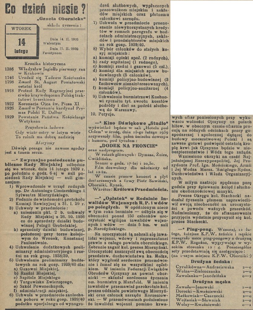- 14 lutego 1937 r. w lokalu u Geiba ( ul. Czarnkowska) odbyło się pod przewodnictwem Smykowskiego miesięczne zebranie Koła Związku Weteranów.