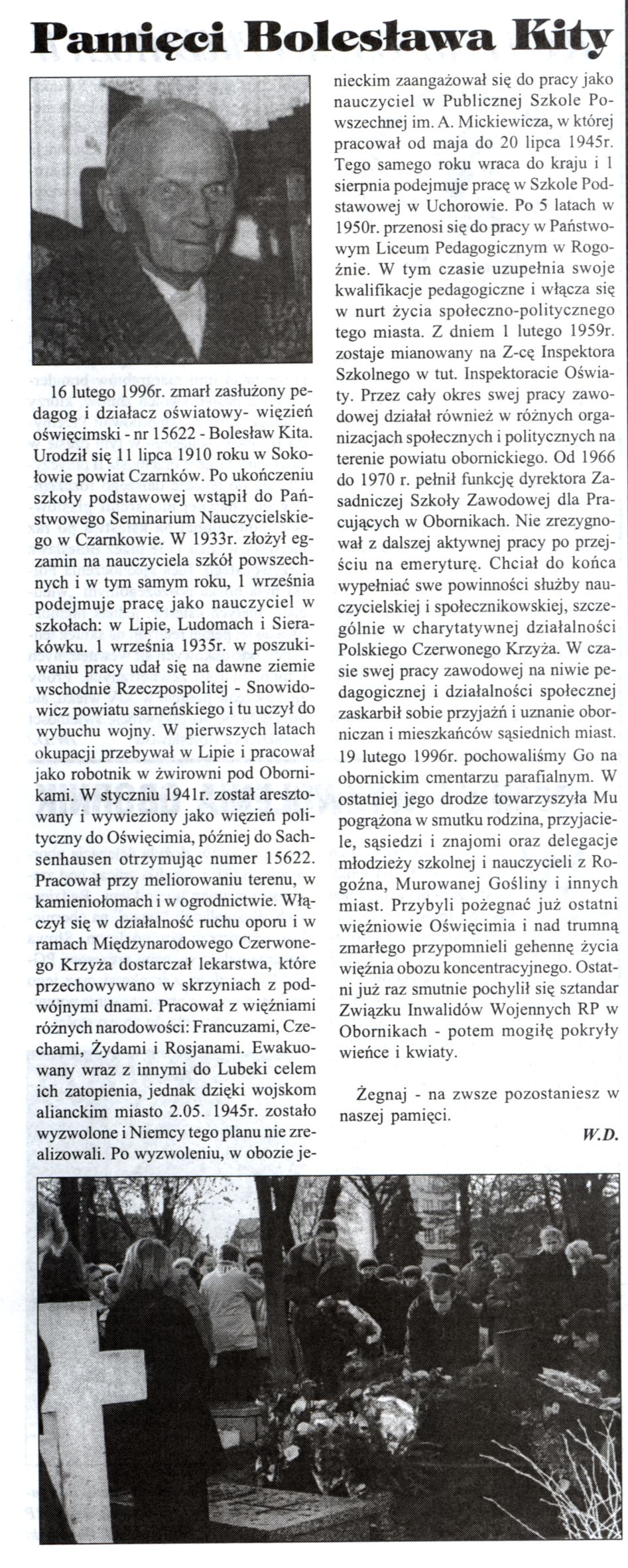 - 16 lutego 1996 r. zmarł Bolesław Kita pedagog i działacz oświatowy