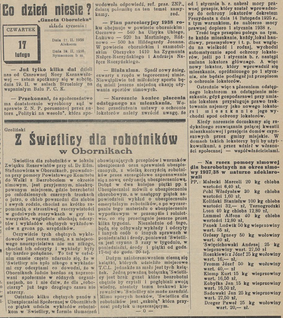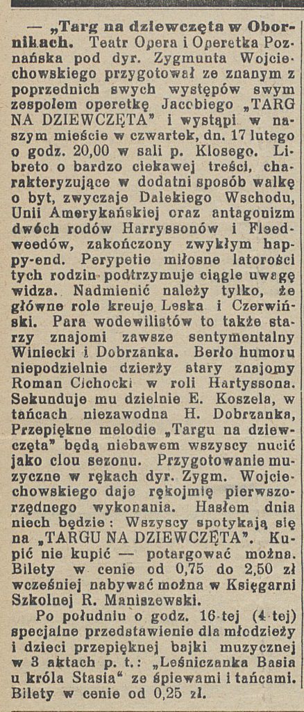 - 17 lutego 1938 r. odbył się w Sali Klosego w Obornikach „Targ na dziewczęta”