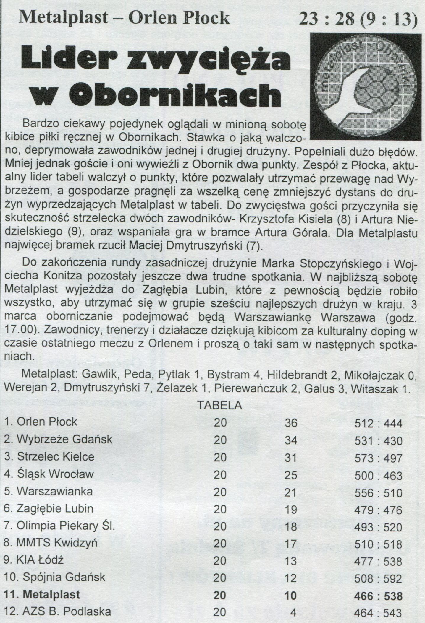 - 17 lutego 2001 r. w meczu o mistrzostwo I ligi mężczyzn w piłce ręcznej Metalplast Oborniki przegrał z Orlenem Płock 28:23