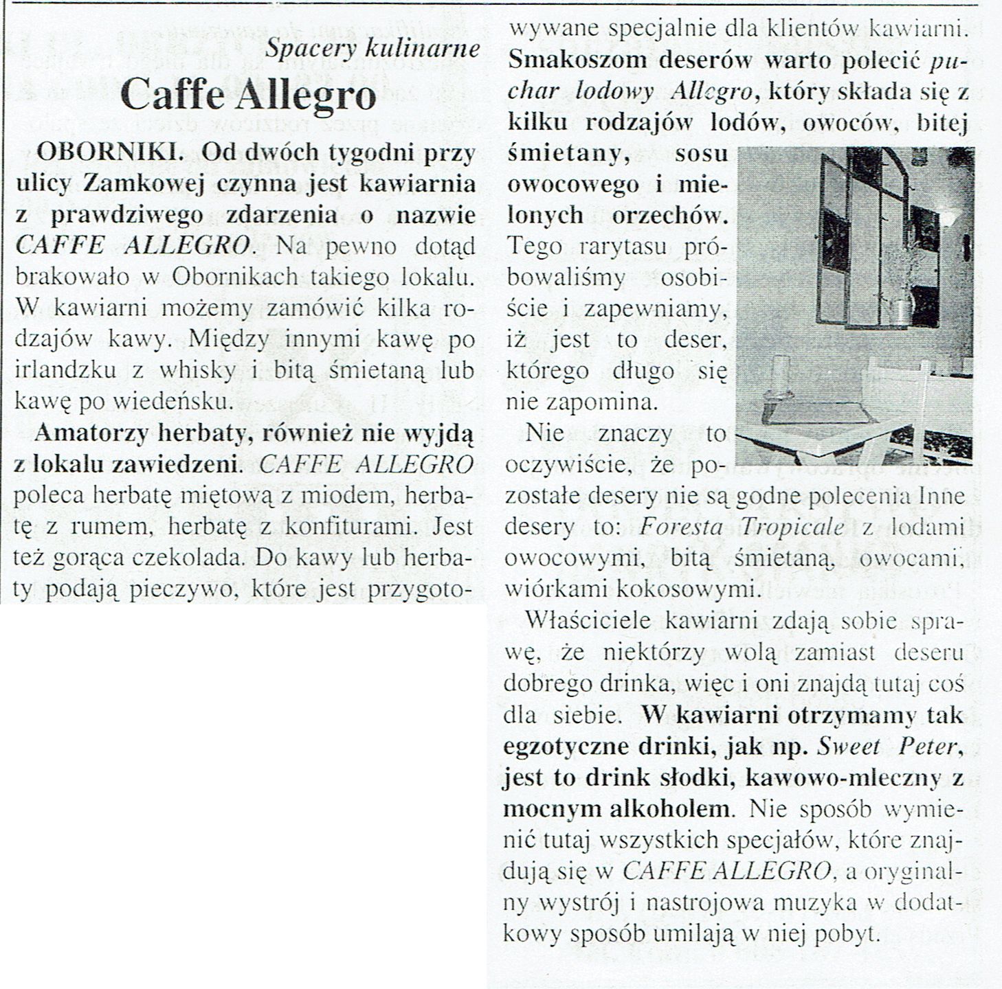 - 17 lutego 2003 r. punktualnie o godz. 18.00 odbyło się otwarcie nowego lokalu w Obornikach Caffe Allegro. Właścicielami lokalu byli państwo Anna I Bogdan Chołdrych, a lokal znajdował się na ul. Zamkowej.