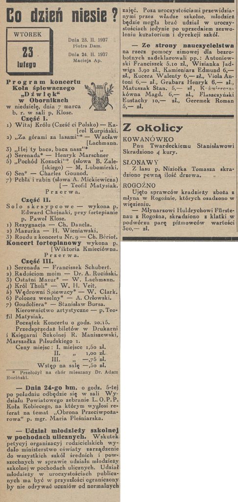 - 23 luty 1939 r. Kino Dźwiękowe Studio w sali Hotelu pod Orłem wyświetliło film polski pt. Królowa Przedmieścia z H. Grossówną, Sielańskim i Żabczyńskim w rolach głównych. W trakcie przerwy po między seansami, widzowie mogli posłuchać muzyki z płyt dostarczonych przez firmę Sawiński z Obornik.
