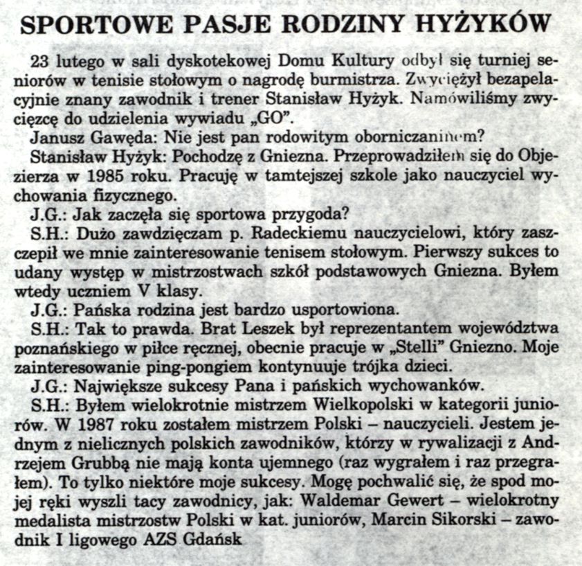 - 23 lutego 1991 r. w Sali Domu Kultury odbył się turniej seniorów w tenisie stołowym. Zwyciężył go Stanisław Hyżyk, trener i nauczyciel wychowania fizycznego w Objezierzu. Pan Stanisław w 1987 r. zdobył mistrzostwo Polski nauczycieli.