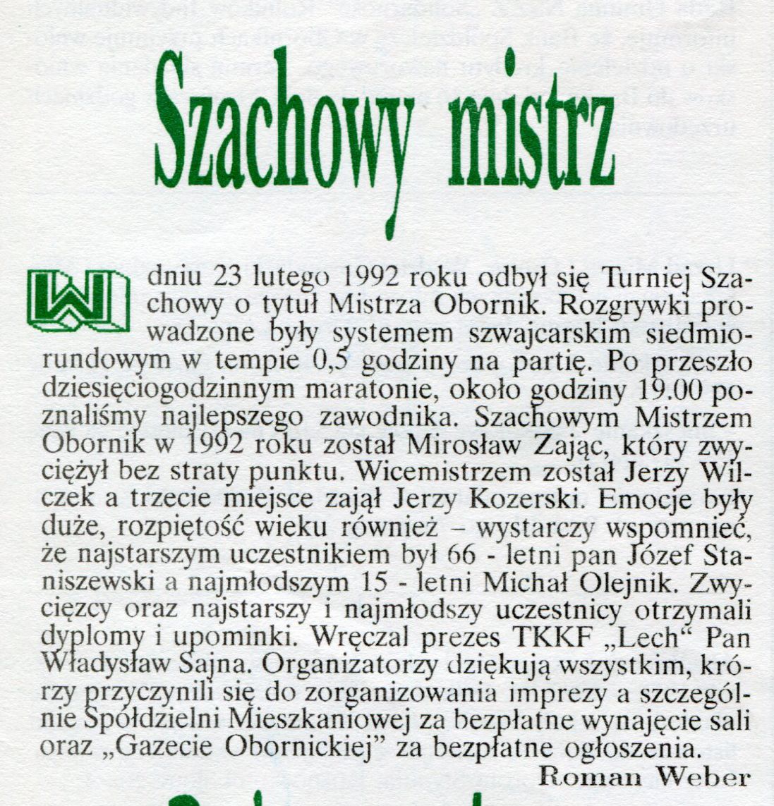 - 23 lutego 1992 r. odbył się Turniej Szachowy o tytuł Mistrza Obornik. Rozgrywki prowadzone były systemem szwajcarskim. Po przeszło pięciogodzinnym maratonie Mistrzem Obornik w 1992 r. został Mirosław Zając, Wicemistrzem Jerzy Wilczek, a trzecie miejsce zajął Jerzy Kozerski. Najmłodszym uczestnikiem zawodów był 15 letni Michał Olejnik.