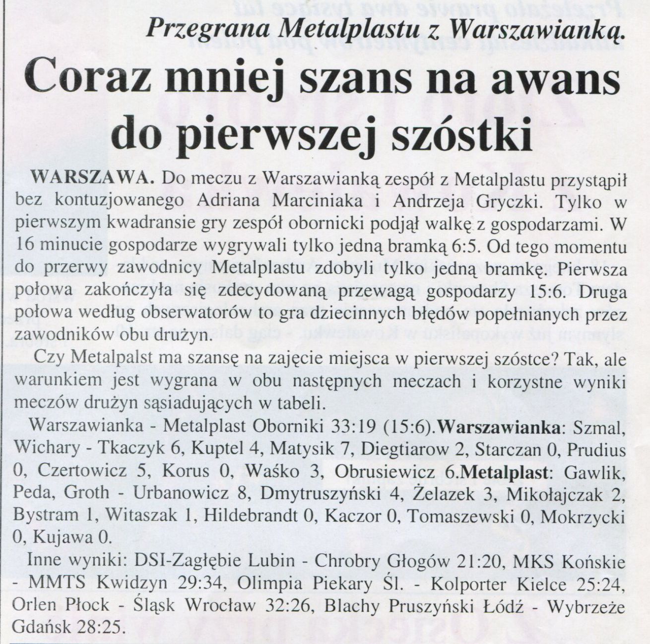 - 23 lutego 2002 r. piłkarze ręczni Metalplastu Oborniki w meczu ekstraklasy mężczyzn w piłce ręcznej przegrali z Warszawianką Warszawa 33:19