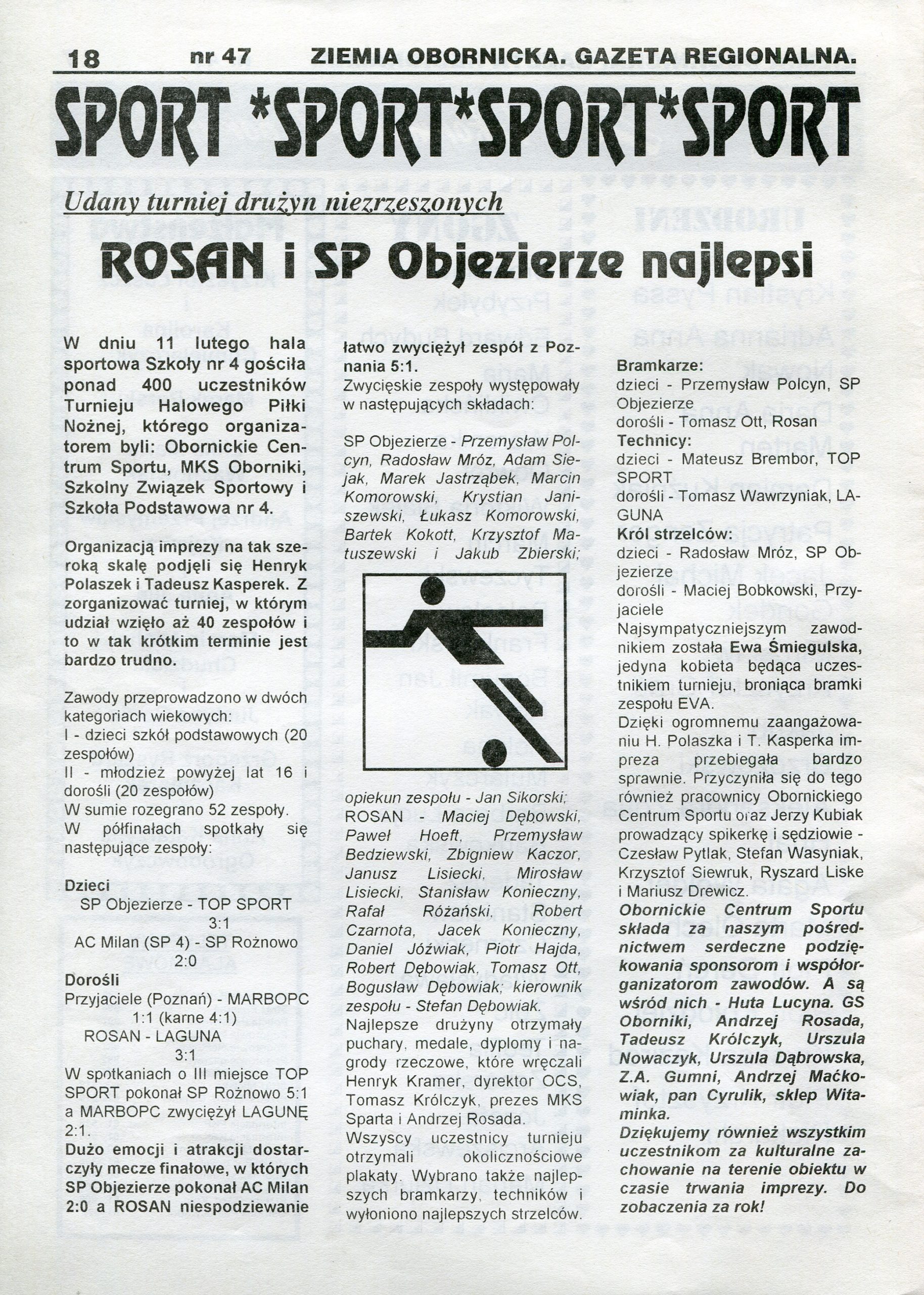 - 11 lutego 1996 r. w hali Szkoły Podstawowej nr 4 w Obornikach odbył się Turniej Halowy Piłki nożnej. Jego organizatorami byli OCS, MKS Sparta Oborniki, Szkolny Związek Sportowy i Szkoła Podstawowa nr 4. Organizacji imprezy osobiście podjęli się Henryk Polaszek i Tadeusz Kasperek. W turnieju zagrało ponad 400 zawodników. Najlepszymi zawodnikami zostali: bramkarze: Przemysław Polcyn (dzieci SP Objezierze), Tomasz Ott ( dorośli), technicy: Mateusz Brembor (dzieci TOP Sport), Tomasz Wawrzyniak (dorośli laguna), królami strzelców zostali: Radosław Mróz (dzieci SP Objezierze), Maciej Bobkowski ( dorośli Przyjaciele)