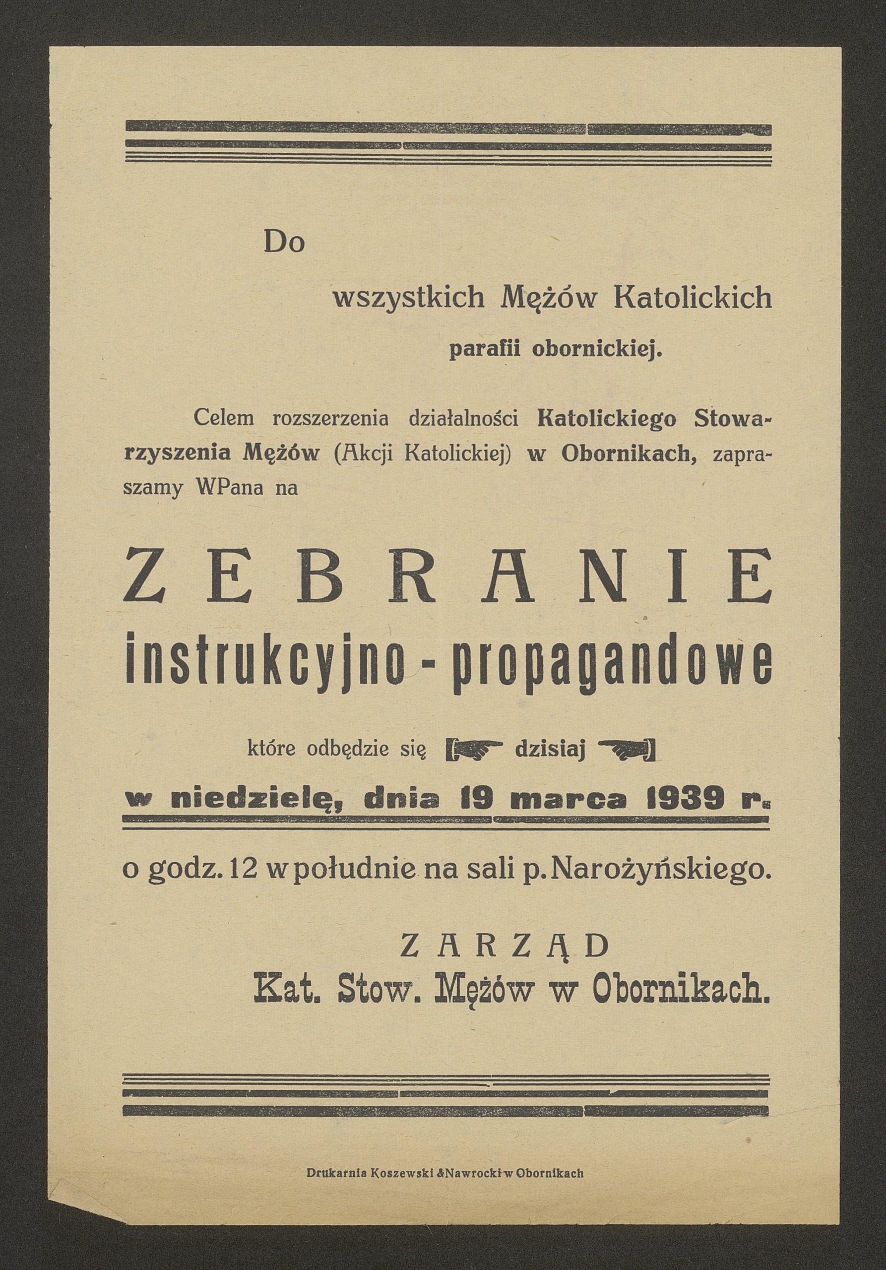 - 19 marca 1939 r. odbyło się zebranie Katolickiego Stowarzyszenia Mężów Akcji Katolickiej